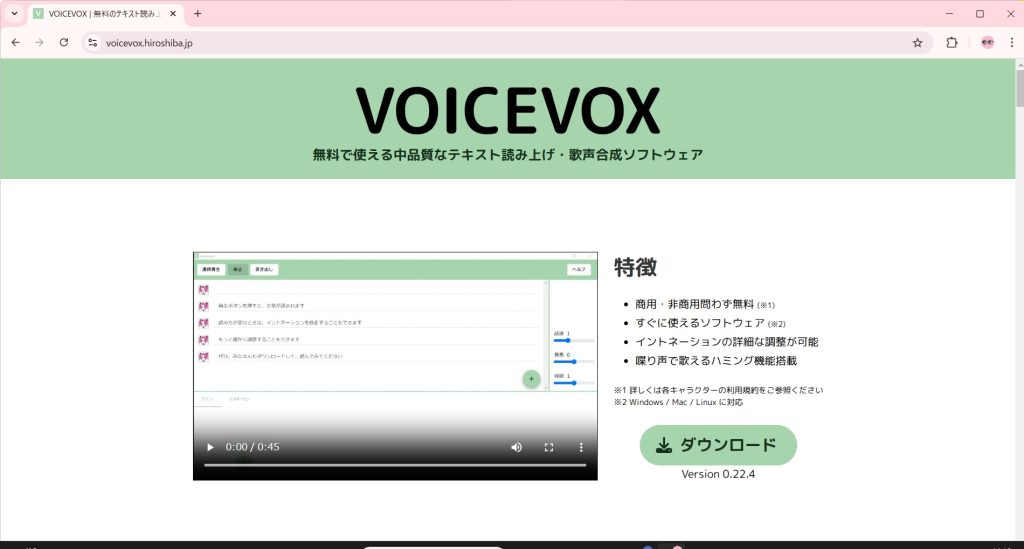 上のリンクをポチっとするか、ブラウザで「VOICEVOX」を検索して、この画面を表示します。